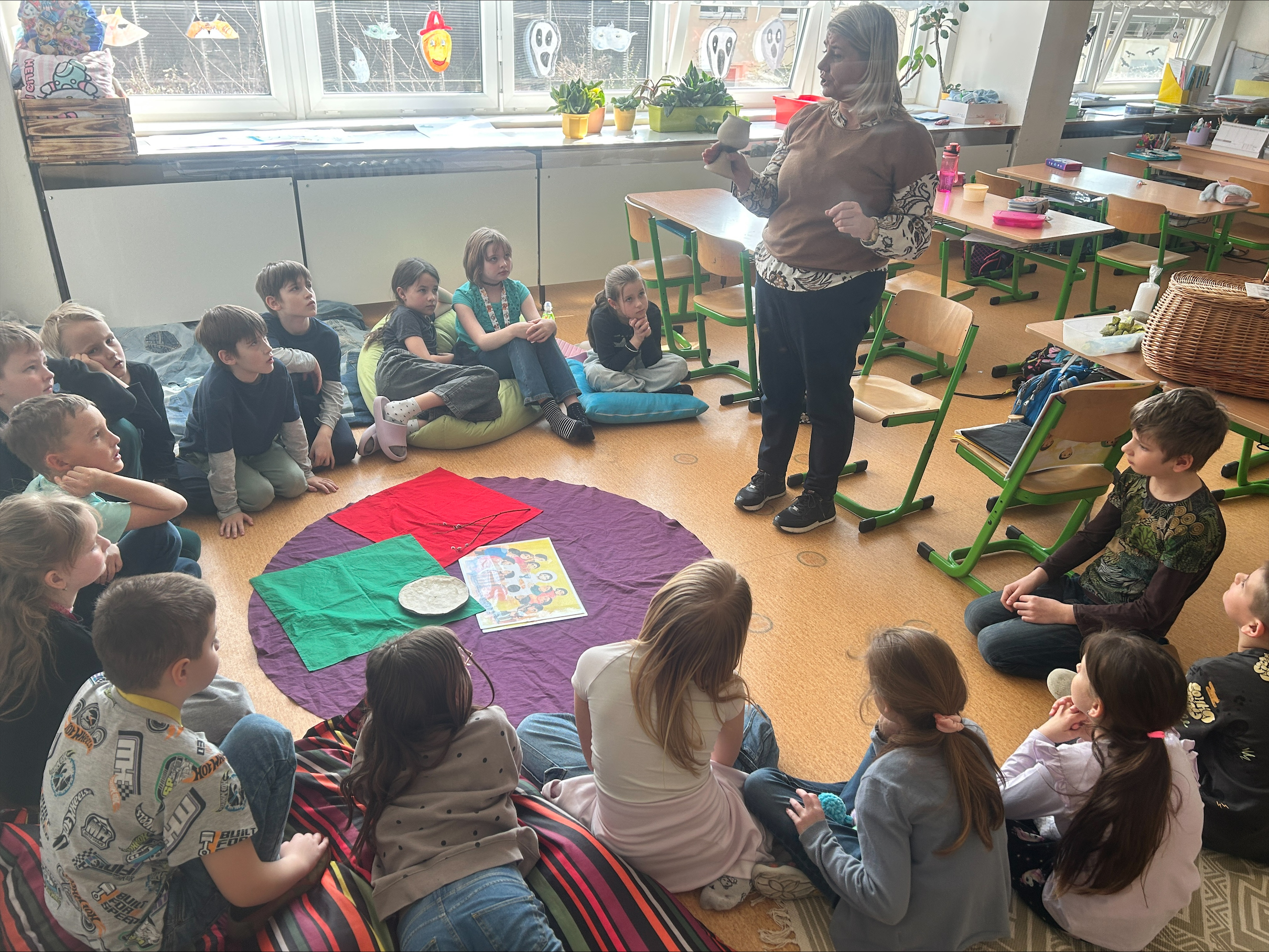 Děti seděly v kruhu, což podpořilo příjemnou atmosféru i vzájemné sdílení. Během celé hodiny se aktivně zapojovaly a s chutí reagovaly na jednotlivé aktivity.